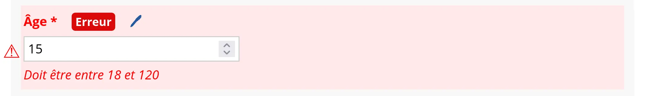 Plusieurs widgets intégrés à Goupile sont capables de générer une erreur à partir d'options simples. C'est par exemple le cas du widget numérique (form.number) qui peut signaler une erreur lorsque la valeur est trop petite (supérieure option min) ou trop grande (supérieure à l'option max).