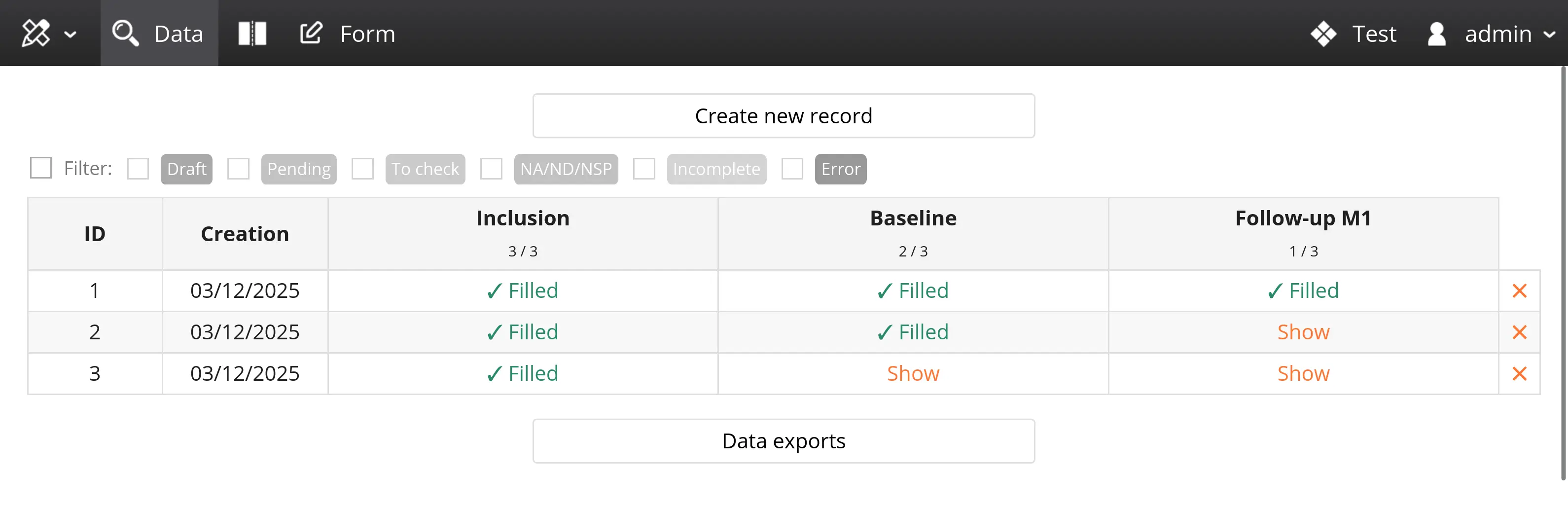 When a variable is annotated with a status, the record inherits the statuses of all the variables it contains. In the monitoring table, statuses are displayed as small colored dots next to the record and the corresponding page.