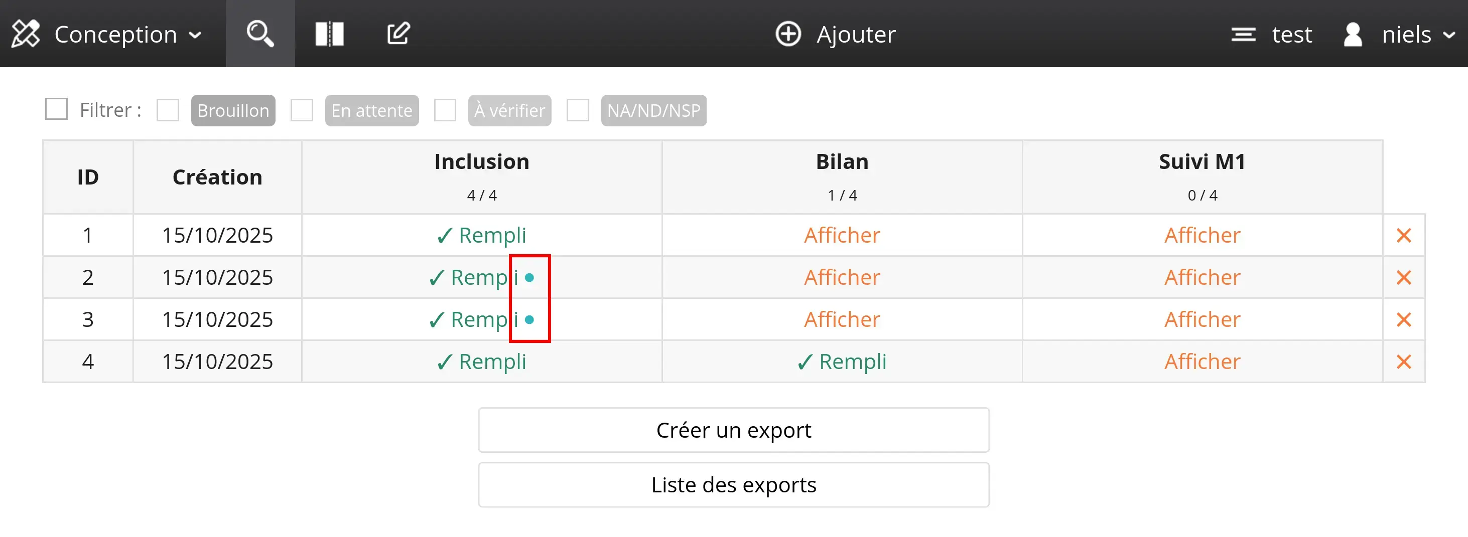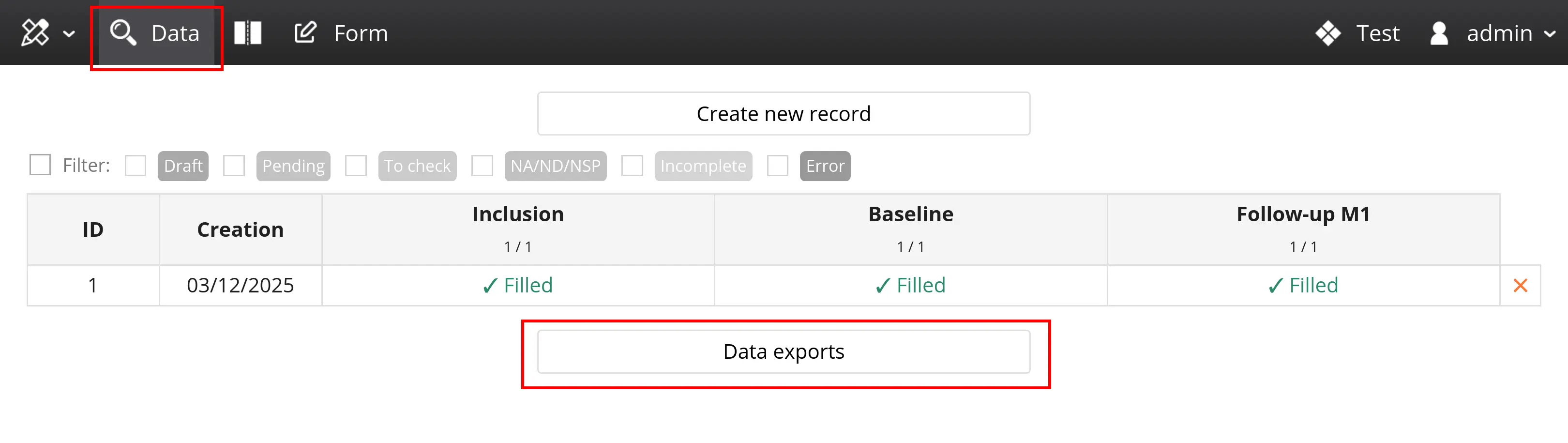 Each record feeds the data monitoring table, accessible via the data panel (highlighted in red below). This table is displayed by default when you log in to a Goupile project.