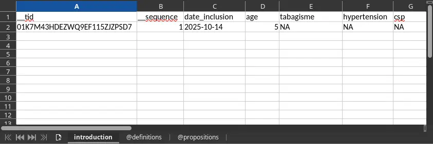 The @definitions sheet includes four columns: the first indicates the table (or page) concerned, the second the variable name, followed by the user-facing label, and finally the data type.