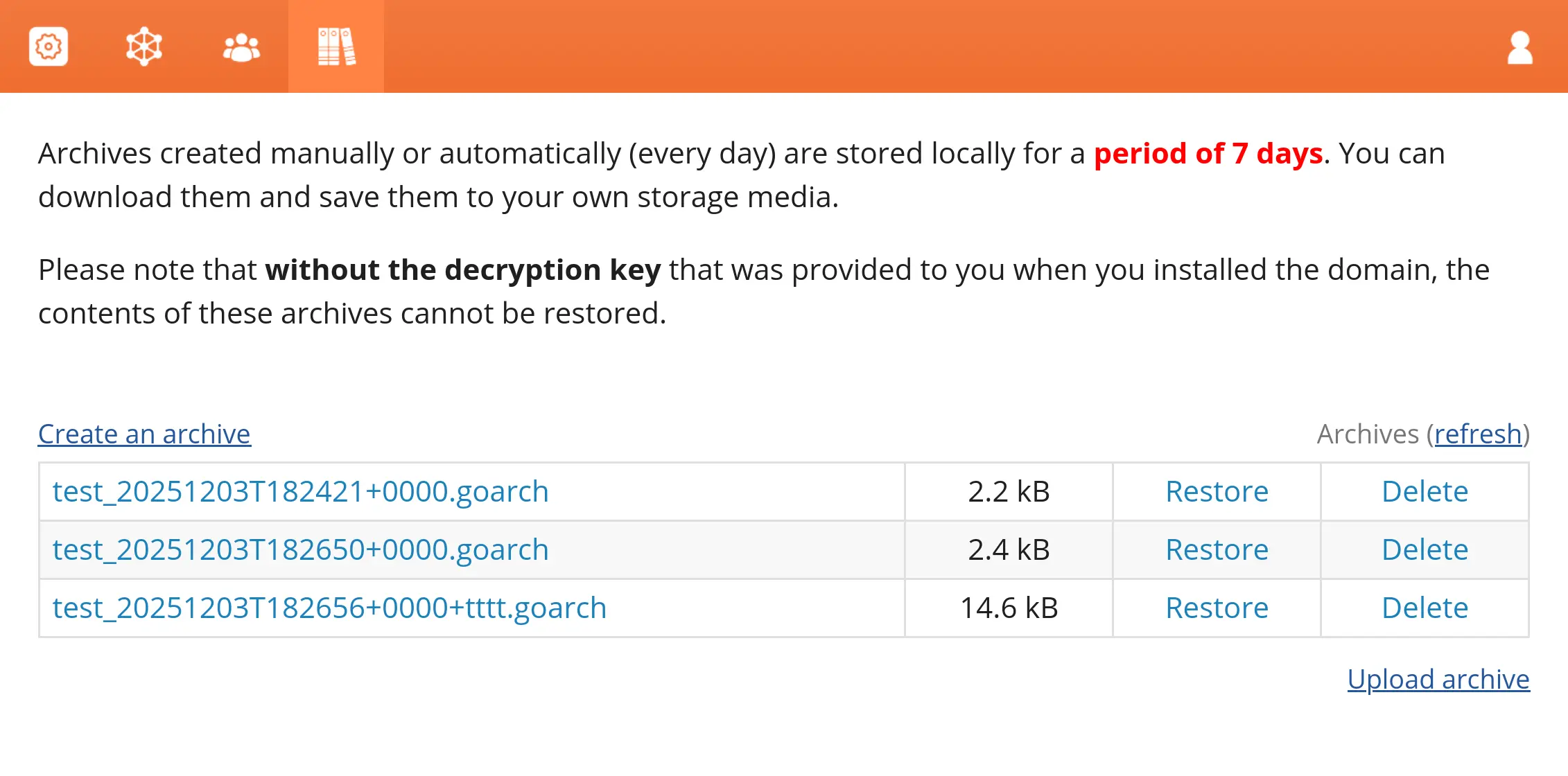 Archives created within the last 7 days are kept on the server before being deleted. However, you can download them (files with the .goarch extension) and store them securely to restore their contents if needed.