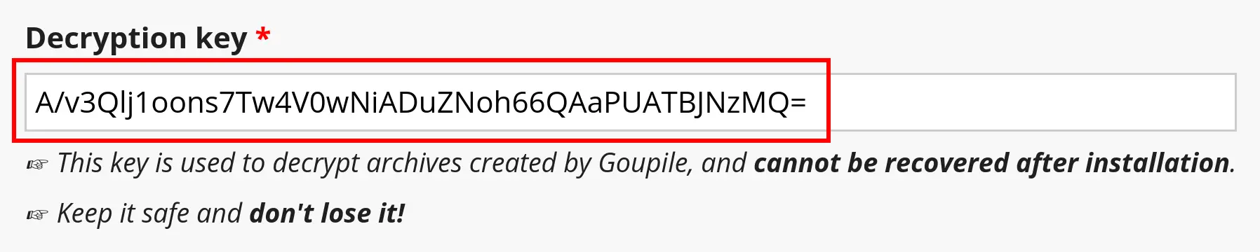 To open or restore an archive, you must keep the restoration key provided during Goupile installation.