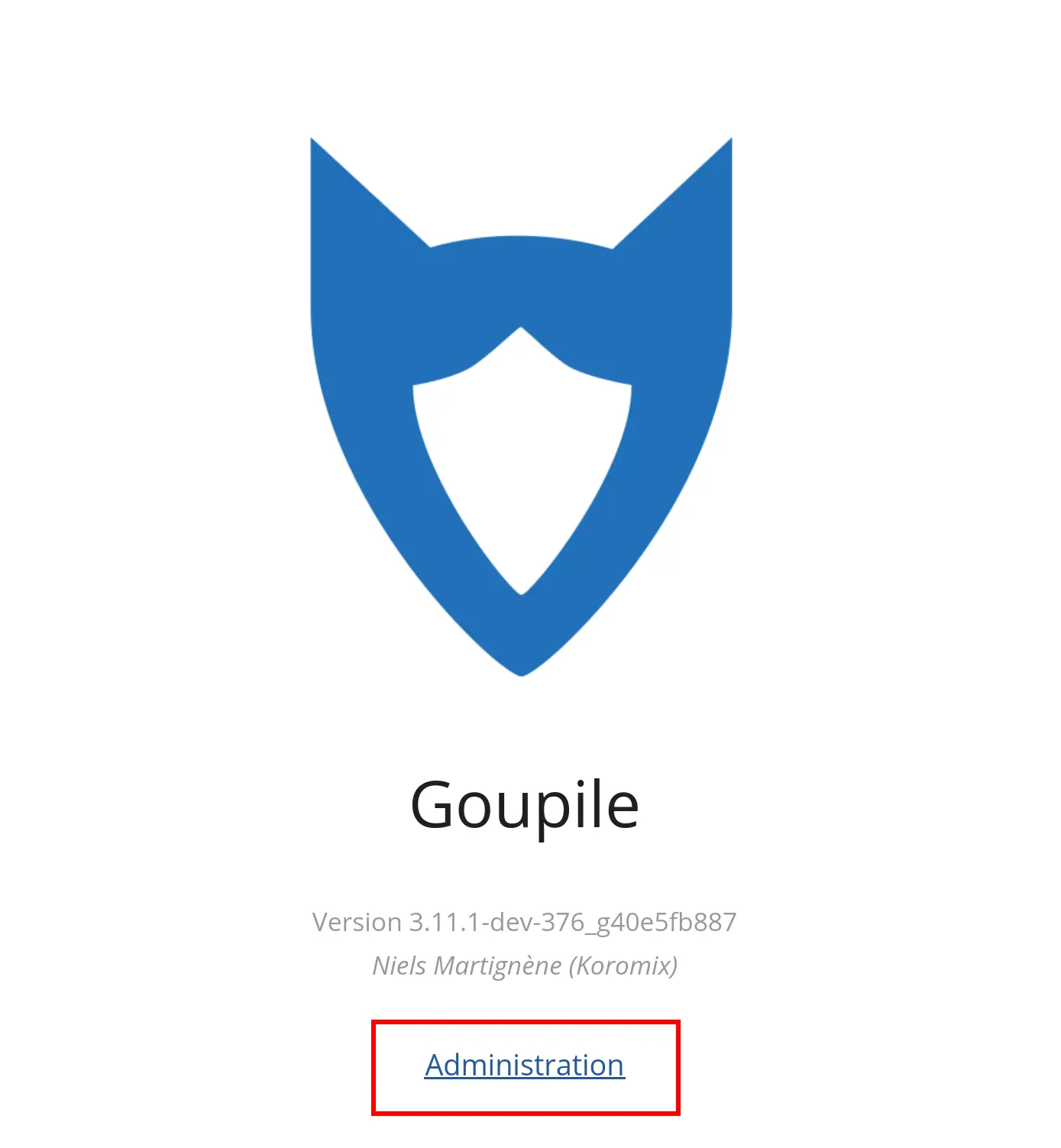 The administration module is available by opening the address where you installed Goupile (for example, http://localhost:8889) and clicking on the administration link.