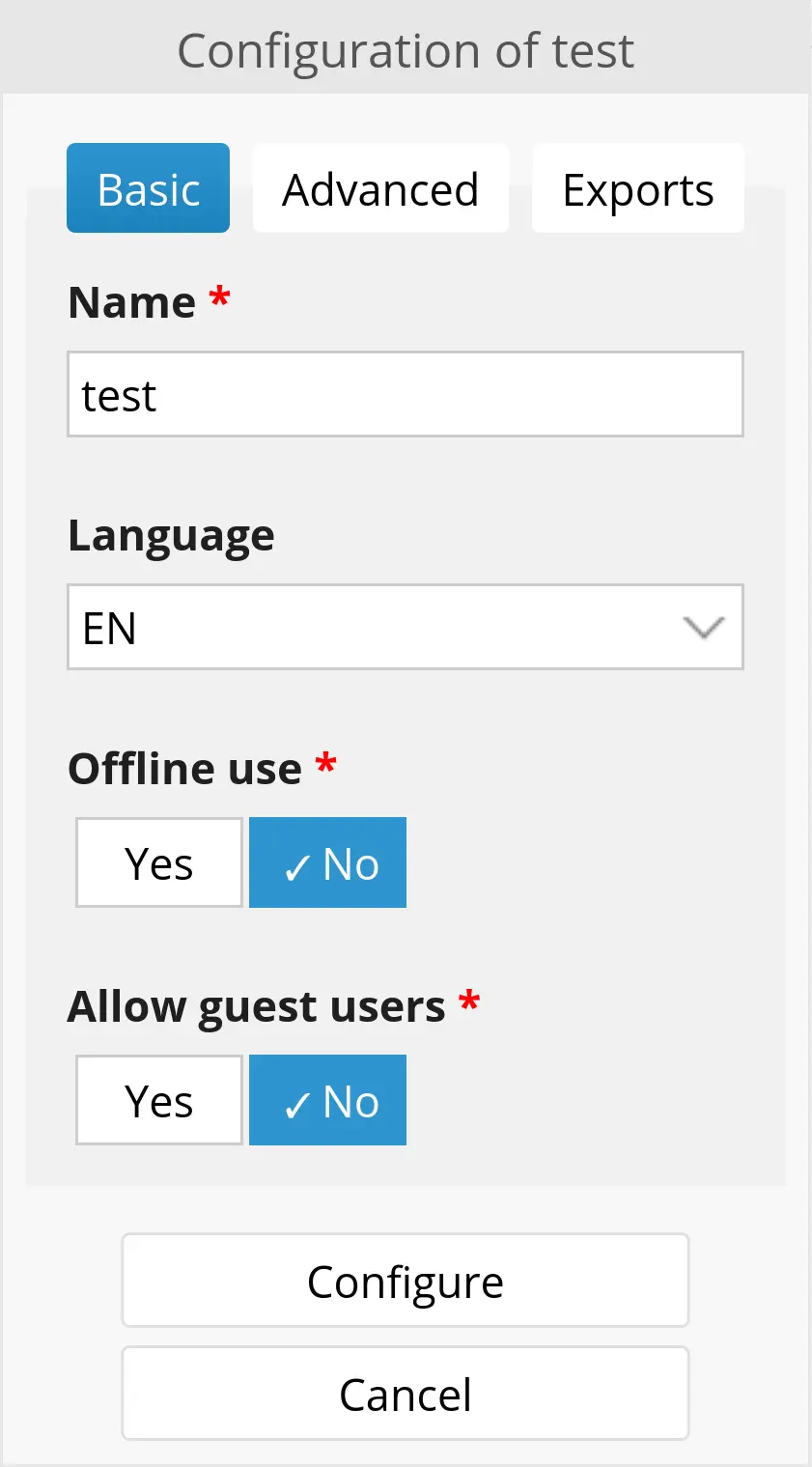 - Configure function: modifies certain settings, such as the title or allowing guest user access (for public questionnaires)