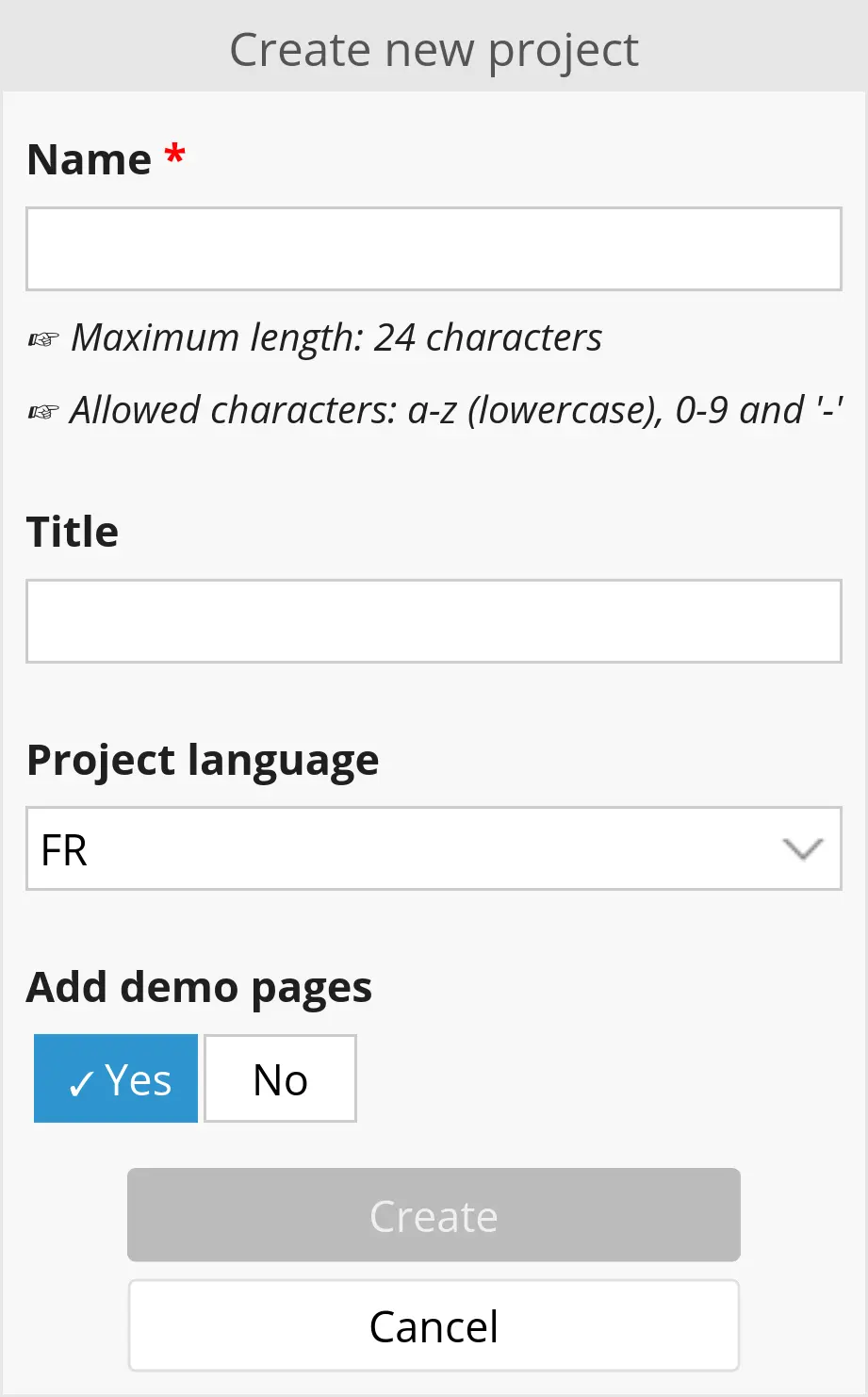 Create a project by clicking on "Create a project" above the list of projects. A new window ("Create a project") will appear, in which you must configure: