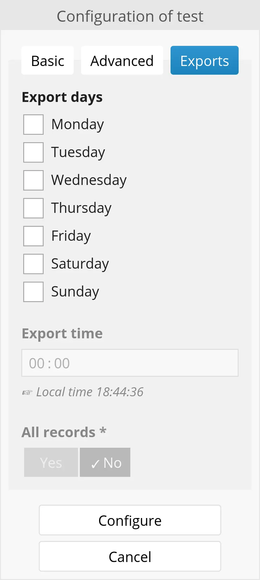 You can configure the project to perform an automated export on specific days at a fixed time. Each export will be available in the exports list under the monitoring table.