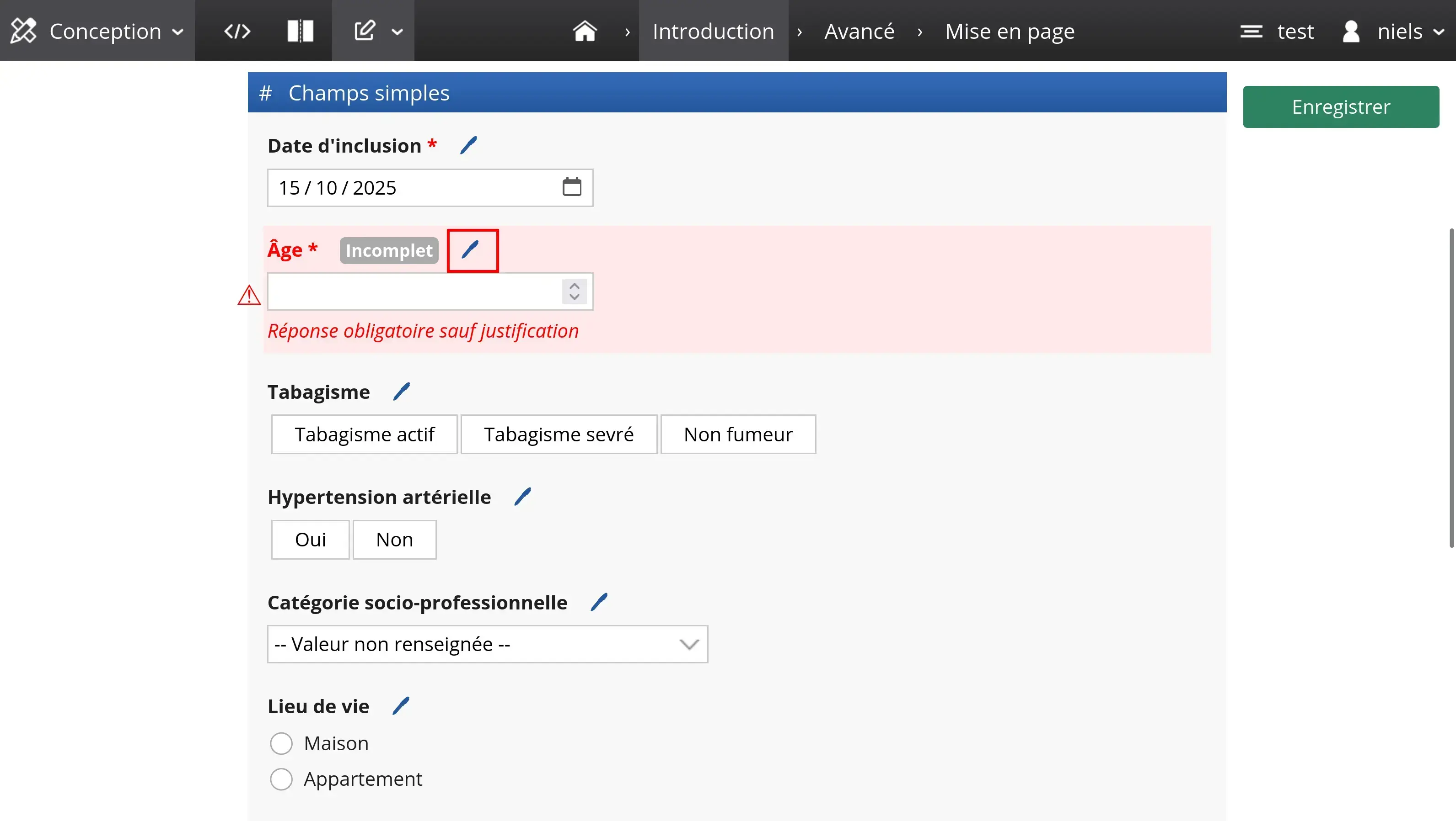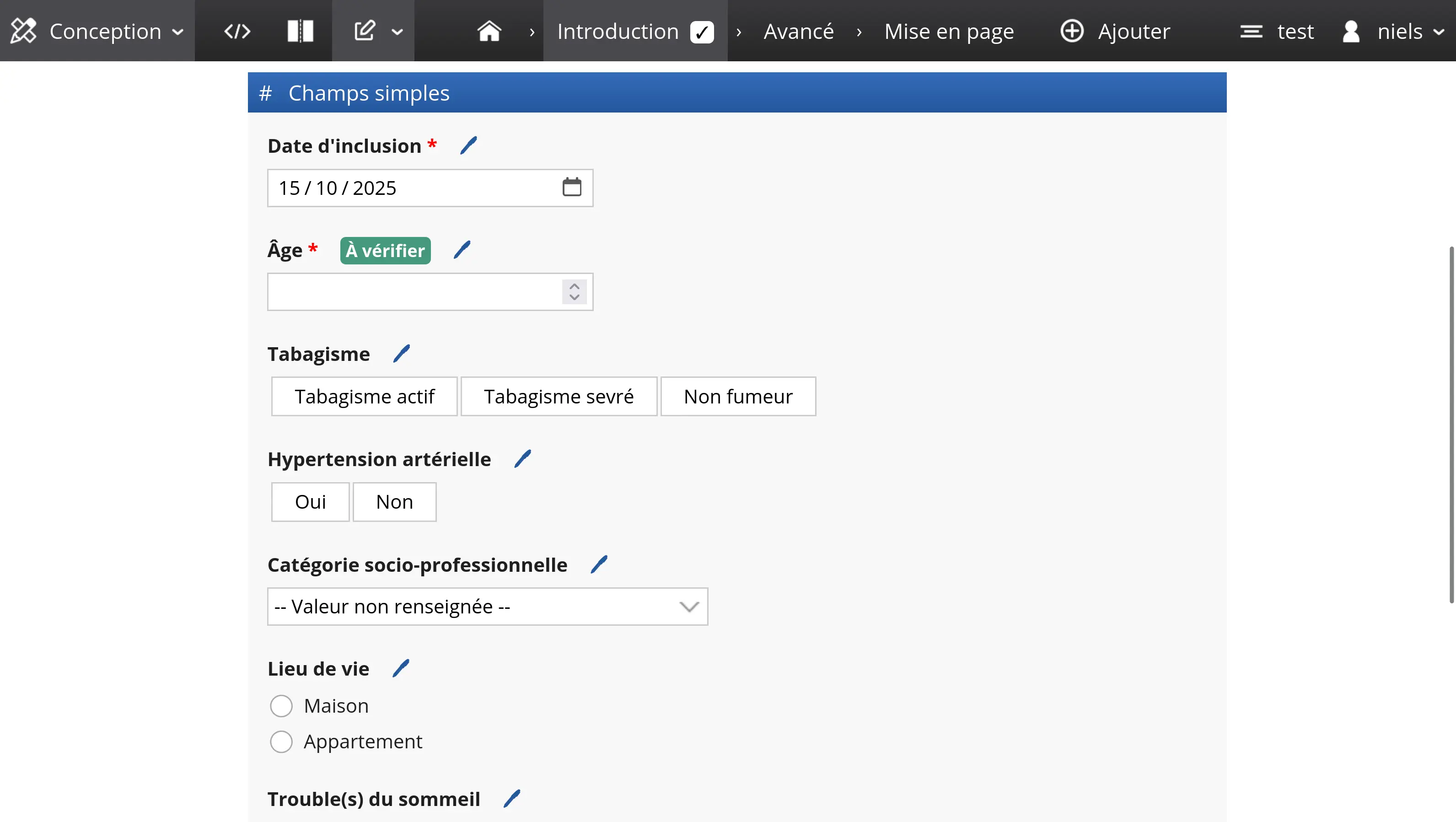 Dans le tableau donné en exemple ci-dessous, deux variables sont définies : une variable d'âge de type numérique (number), et une variable à choix unique (enum) relative au tabagisme.