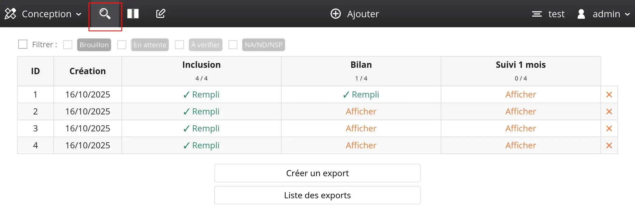 Chaque enregistrement alimente le tableau de suivi, accessible via le panneau de données (encadré en rouge ci-dessous). Ce tableau de suivi est affiché par défaut lorsque vous vous connectez à un projet Goupile.