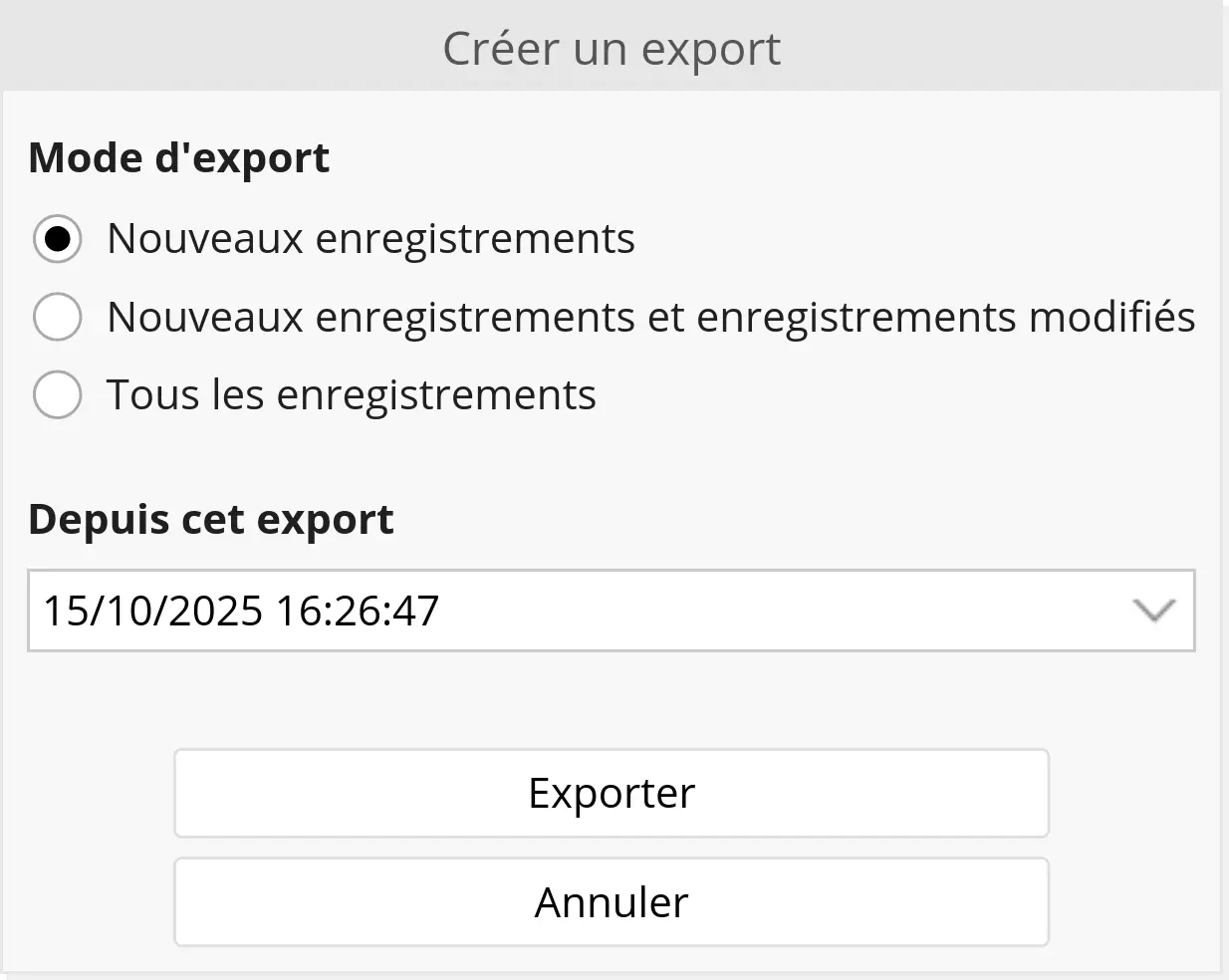 - Les enregistrements créés ou modifiés depuis un export précédent