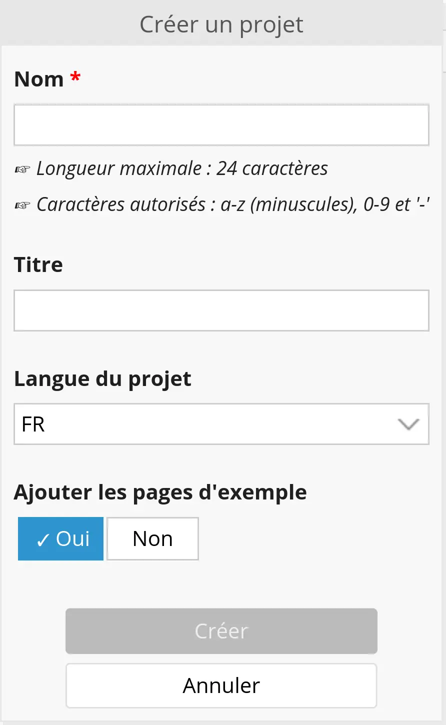 Créez un projet en cliquant sur « Créer un projet » au-dessus de la liste des projets. Une nouvelle fenêtre apparaît (« Création d'un projet ») dans laquelle vous devez paramétrer :