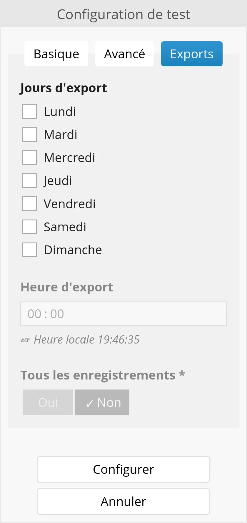 Vous pouvez paramétrer le projet pour réaliser un export automatisé certains jours, à une heure fixe. Chaque export sera disponible dans la liste des exports sous le tableau de suivi.