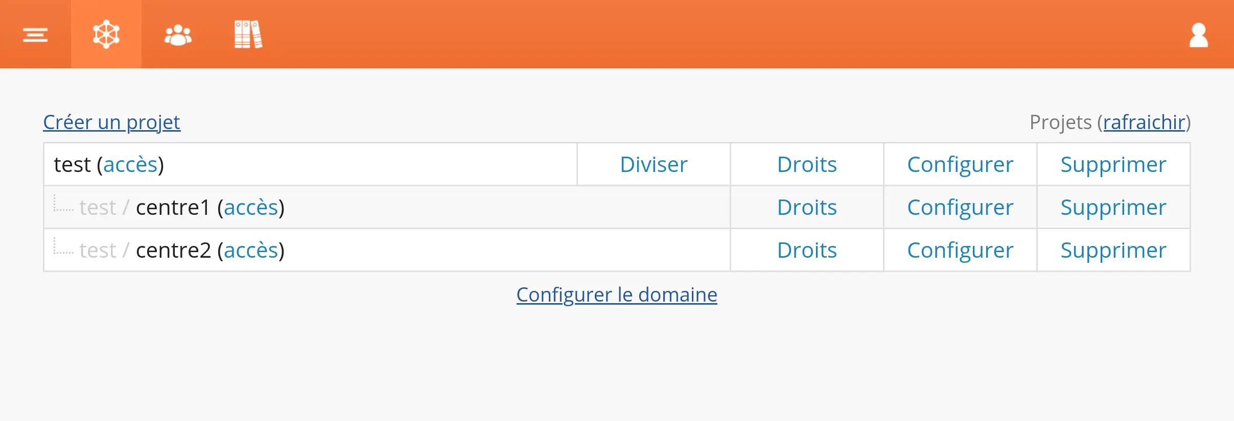 Chaque division entraine la création d'un nouveau centre, comme sur la capture ci-dessous où 2 centres sont créés pour le projet "test".