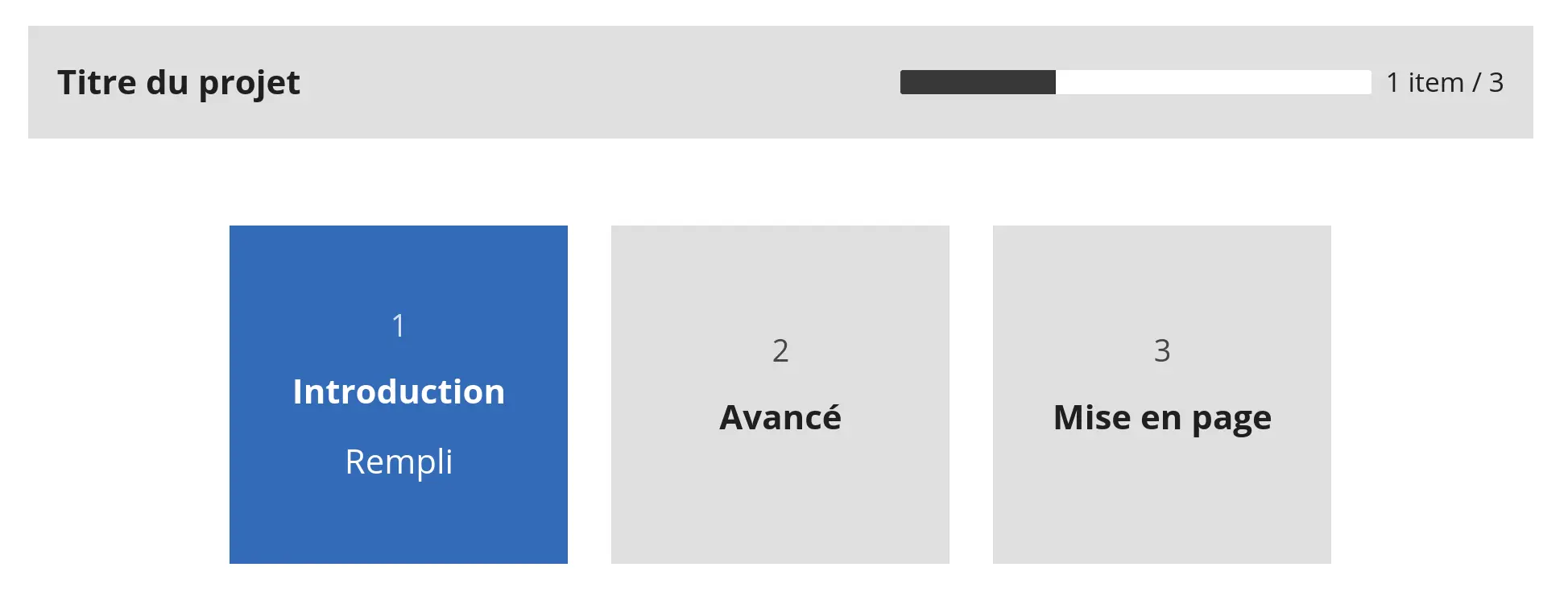 Sur un projet par défaut, ceci ouvrira la page de statut de l'enregistrement, qui affiche l'état de remplissage des différentes pages qui composent le projet. Les tuiles correspondent aux différentes pages :