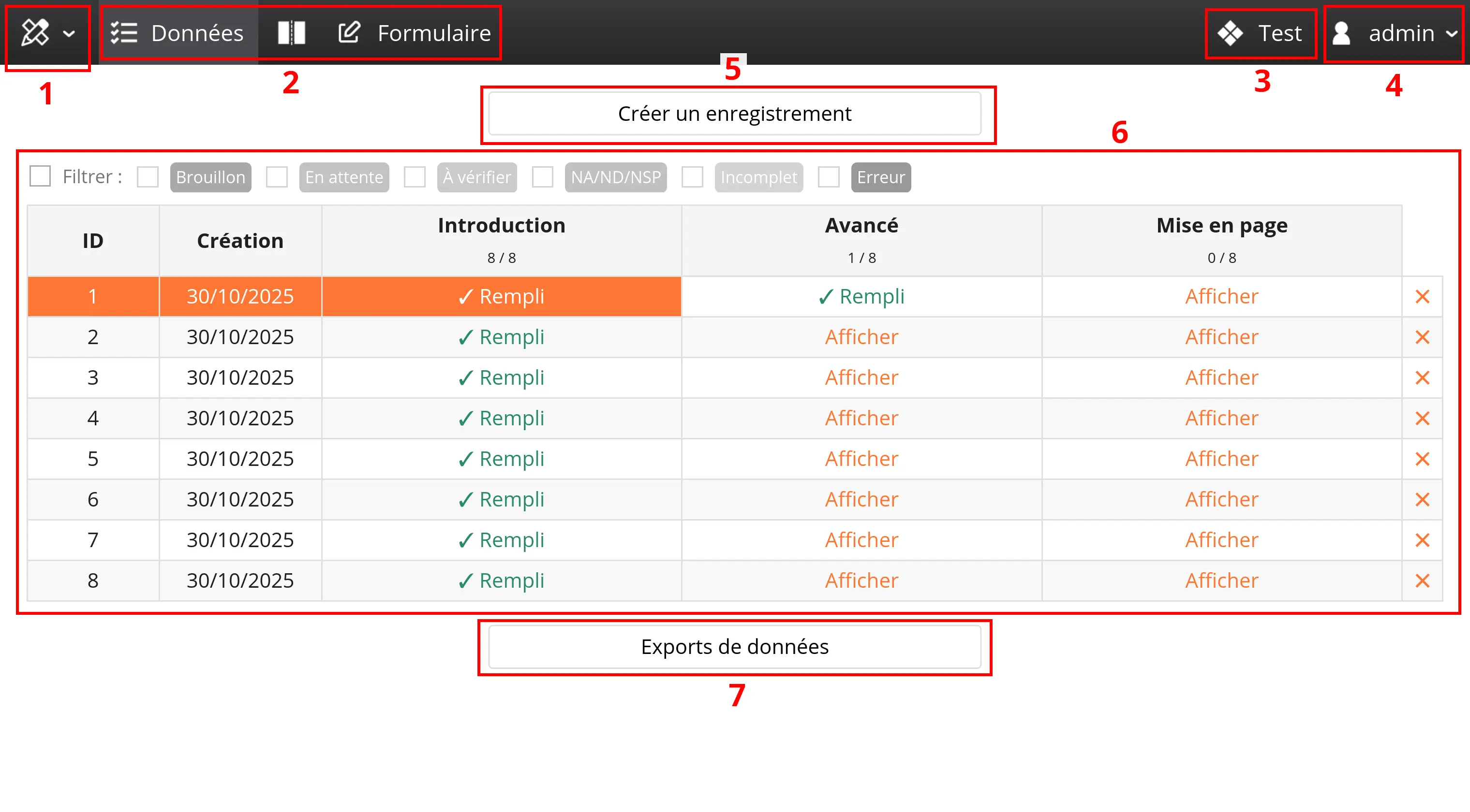 - La liste des enregistrements qui comprend plusieurs colonnes : un identifiant séquentiel d'enregistrement, la date de création et une colonne de statut par page.